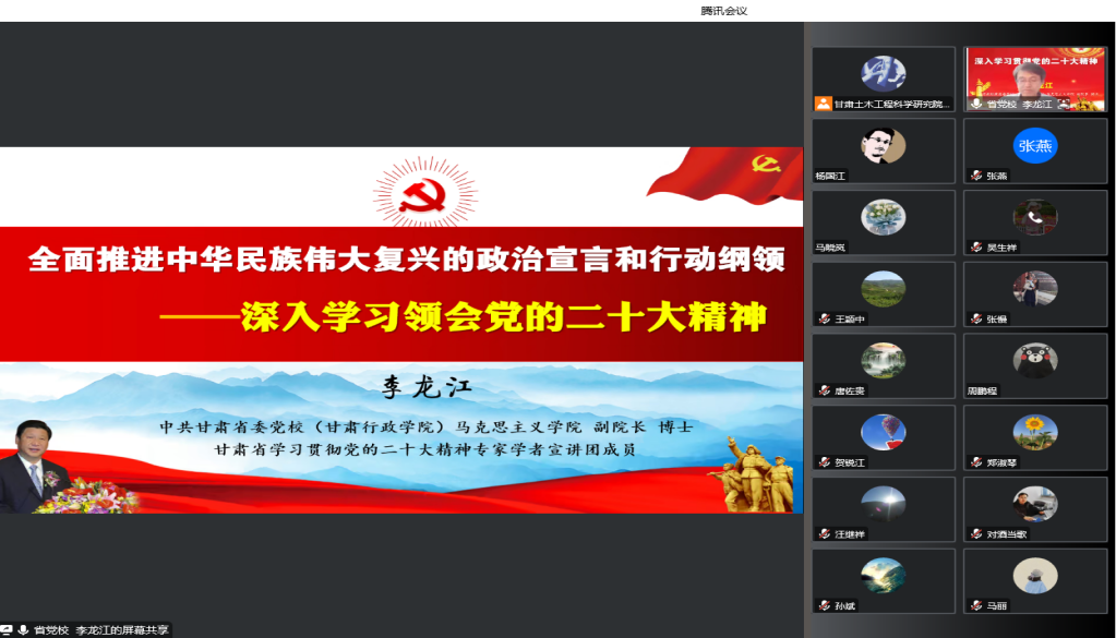 會議邀請省委黨校馬克思主義學院副院長、全省學習貫徹黨的二十大精神專家學者宣講團成員李龍江教授作了題為《全面推進中華民族偉大復興的政治宣言和行動綱領——深入學習領會黨的二十大精神》的專題講座。以黨的二十大報告為主線,結合國有企業高質量發展具體事例,對黨的二十大精神進行了全面深入、系統詳盡的闡釋解讀,使全體黨員干部職工從多方面、多角度對黨的二十大精神的核心要義有了更為清晰和深刻的認識,對進一步全面學習、全面把握、全面落實黨的二十大精神起到了積極指導作用。
