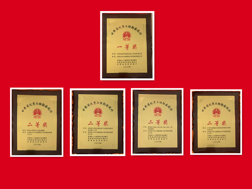 科研成果在工程實踐中開花結果,多個項目獲技術表彰獎勵:《民勤縣紅崖山水庫加高擴建工程》獲甘肅省優秀工程勘察設計一等獎;《石羊河流域重點治理項目西營河專用輸水渠工程》《古浪縣生態移民暨扶貧開發黃花灘項目水利骨干工程》《大通河納子峽水電站工程地質勘察》《昌馬水庫樞紐工程地質勘察》分別獲甘肅省優秀工程勘察設計二等獎;《甘肅中部生態移民扶貧開發供水工程可行性研究報告》獲全國優秀工程咨詢成果獎三等獎;《清水縣“十三五”第二批光伏扶貧電站項目》獲全國優秀工程咨詢成果獎優秀獎。