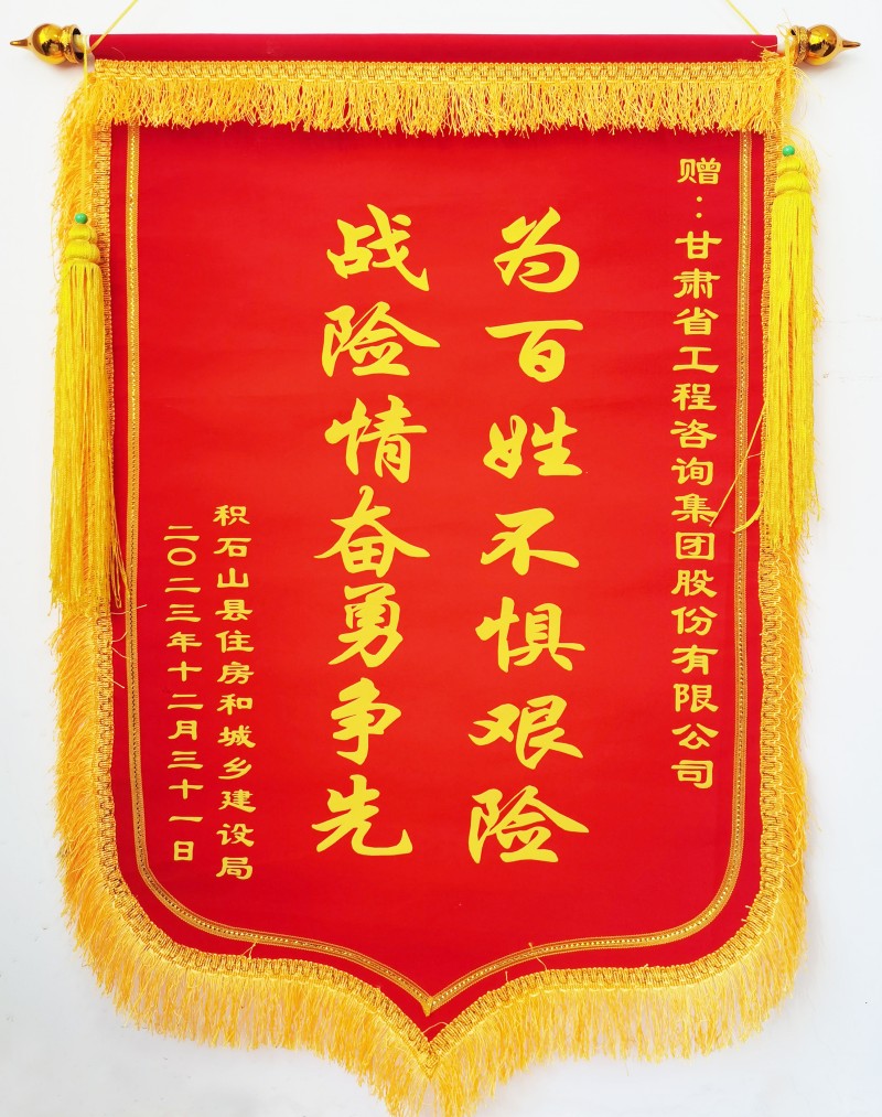 1月3日上午,積石山縣住房和城鄉(xiāng)建設(shè)局向甘肅工程咨詢集團(tuán)贈(zèng)送“為百姓不懼艱險(xiǎn),戰(zhàn)險(xiǎn)情奮勇爭(zhēng)先”錦旗,并發(fā)來《感謝信》,對(duì)在抗震救災(zāi)關(guān)鍵時(shí)刻奔赴災(zāi)區(qū)開展房屋應(yīng)急評(píng)估工作的專家表達(dá)感謝和敬意。