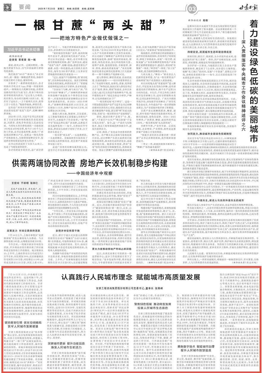 7月14日至15日,中央城市工作會議在北京舉行。這是時隔十年,黨中央再次召開的城市工作會議,為新時代新征程城市工作指明方向。甘肅工程咨詢集團(tuán)深入學(xué)習(xí)貫徹習(xí)近平總書記關(guān)于城市工作的重要論述,全面落實(shí)中央城市工作會議精神,認(rèn)真踐行人民城市理念,立足區(qū)域發(fā)展實(shí)際,將集團(tuán)公司七十余年技術(shù)積淀轉(zhuǎn)化為服務(wù)人民需求的實(shí)踐動能,在優(yōu)化城市空間格局、提升城市功能品質(zhì)、推動綠色低碳轉(zhuǎn)型、賦能智慧高效治理等領(lǐng)域精耕細(xì)作,助推全省城市建設(shè)向著高度與溫度并存、發(fā)展與惠民同步的方向邁進(jìn)。