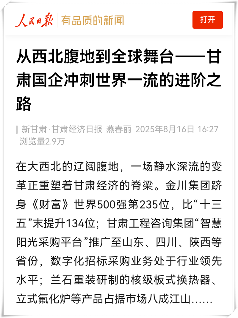 從世界500強的跨越到全國市場的深耕,從技術平臺的輸出到核心產品的壟斷,這些看似分散的閃光點,實則是甘肅國企在不同賽道上奮力奔跑的足跡。這些閃光的坐標,共同勾勒出甘肅國企向世界一流奮力攀登的壯闊圖景。