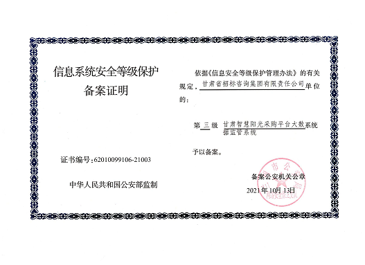 近日,由招標咨詢集團負責開發建設的甘肅智慧陽光采購平臺系統,以及甘肅智慧陽光采購平臺采購網系統、大數據監管系統、招標系統、保證金系統、專家管理系統通過國家三級等保認證,系統管理安全能力獲得業界最高標準。