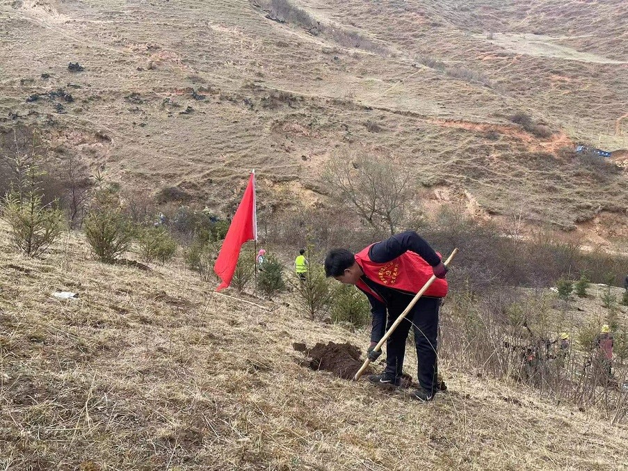 植樹現(xiàn)場,黨旗招展,有的揮鍬鏟土,有的扶樹填坑,有的澆水灌根,大家分工合作,默契配合,干勁十足,認(rèn)真完成每一道工序。在大家的共同努力下,由交通監(jiān)理公司運送的800余棵云杉樹苗迎風(fēng)挺立,為馬旦溝村再添一抹新綠。