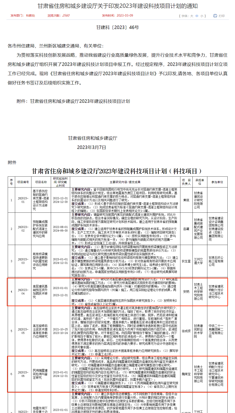 近日,從《甘肅省住房和城鄉建設廳關于印發2023年建設科技項目計劃的通知》(甘建科〔2023〕46號)獲悉,由土木工程院組織申報的兩項科技攻關項目《高層建筑基礎預壓頂升加固技術研究》(立項編號JK2023-03)、民用隔震建筑檢測與鑒定研究(立項編號JK2023-06)和兩項軟課題《2022-2023年度甘肅省民用建筑能耗統計數據分析與研究》(立項編號JK2023-45)、《2022年度甘肅省建筑能耗監測平臺的能耗數據分析與研究》(立項編號JK2023-46)成功獲批立項。