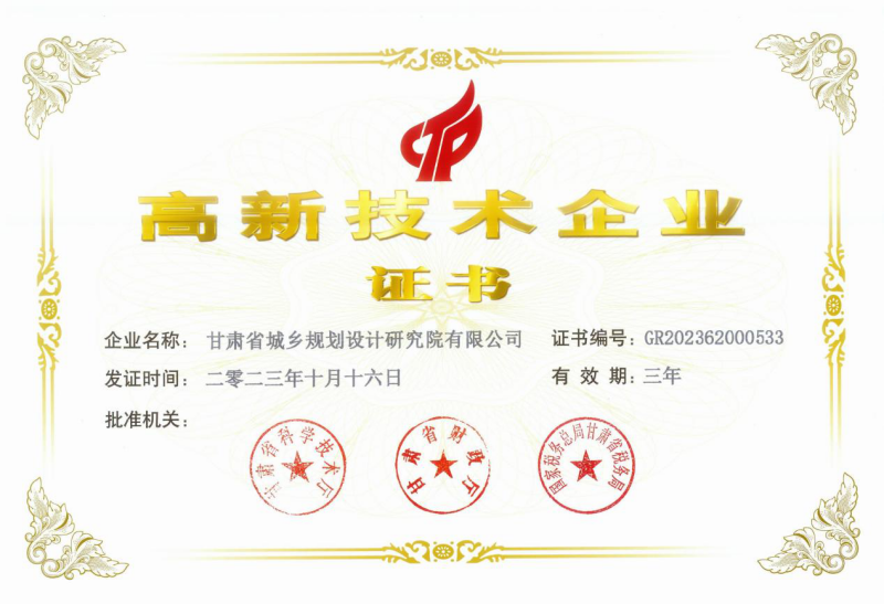近日,經過嚴格的審批程序,省規劃設計院申報的國家高新技術企業最終通過認定并獲得由省科學技術廳、省財政廳和國家稅務總局甘肅省稅務局聯合頒發的“高新技術企業證書”(證書編號:GR202362000533)。
