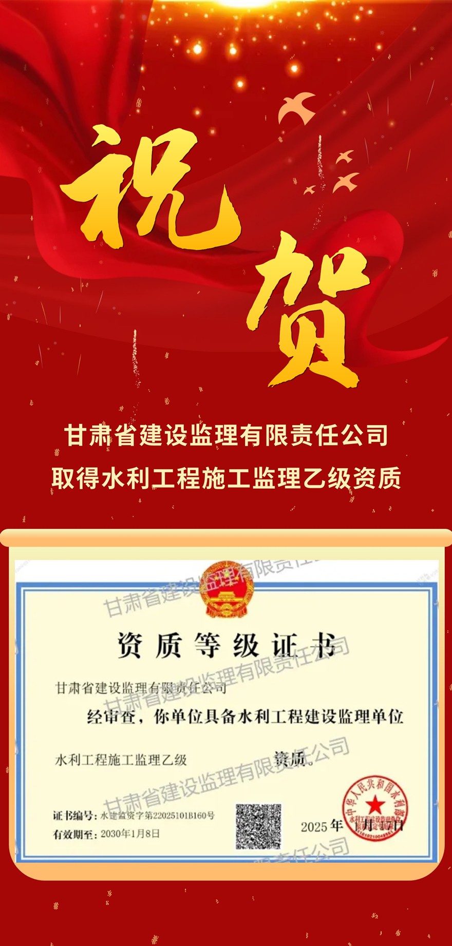 省建設(shè)監(jiān)理公司取得水利工程施工監(jiān)理乙級資質(zhì)