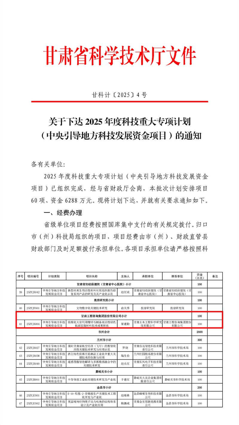 近日,甘肅省科技廳公布了2025年度科技重大專項計劃(中央引導地方科技發展資金項目)立項名單,土木工程院主持申報的“資源化大宗利用煤矸石制備高活性綠色低碳膠凝材料技術成果轉化”項目成功立項。