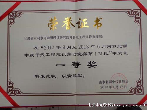 南水北調(diào)中線干線工程建設(shè)勞動(dòng)競賽一等獎(jiǎng)